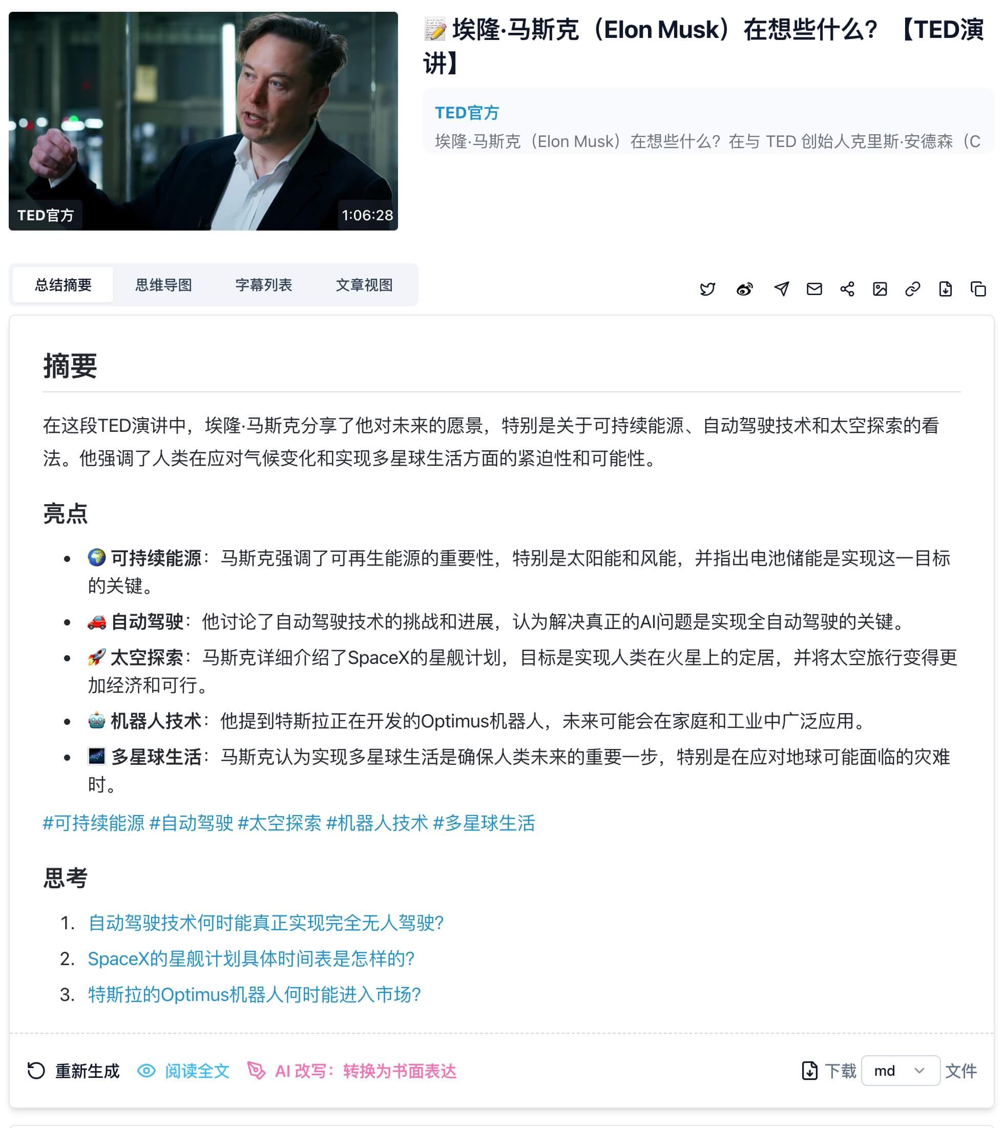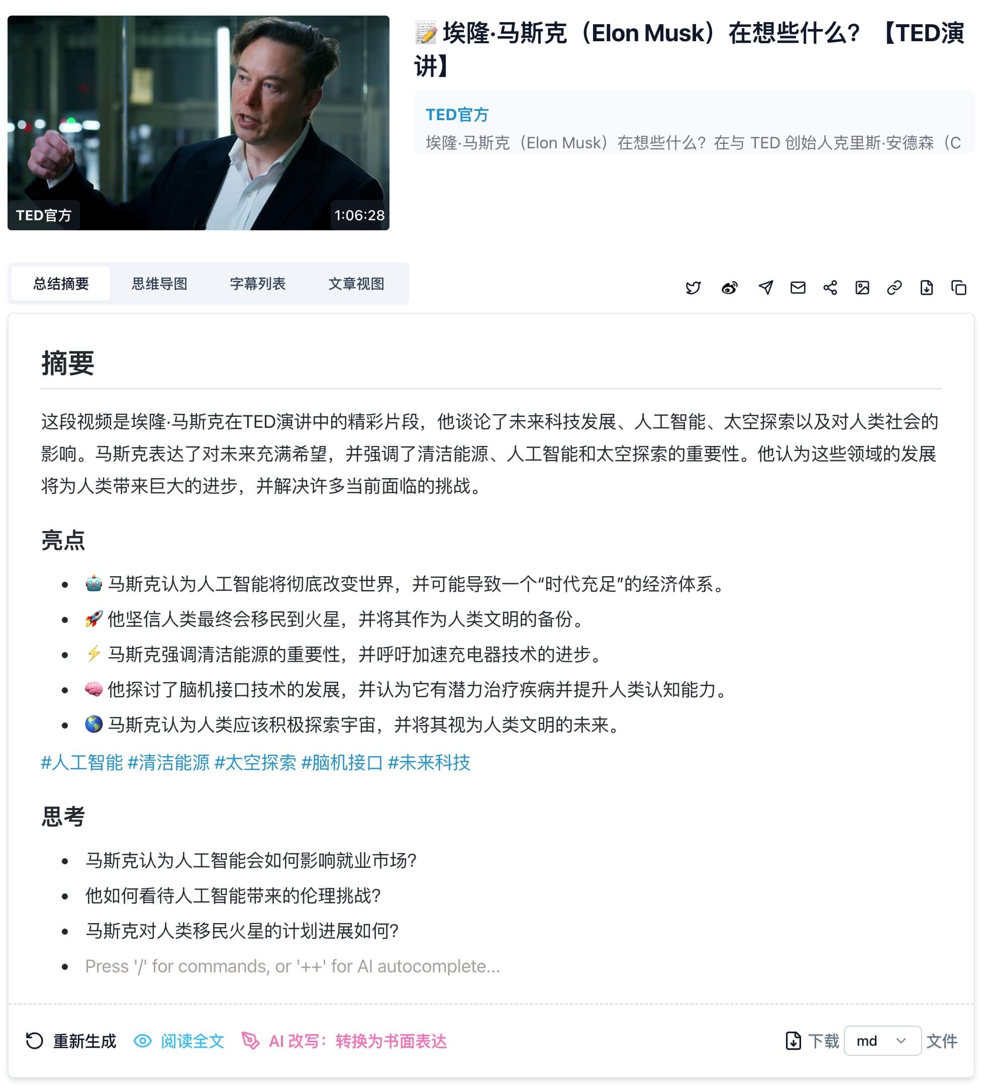 通过BibiGPT,用户不仅可以在高质量的音视频海洋中充分学习和探索,还能在丰富的信息中挖掘出更多有价值的见解。相信在不远的未来,AI总结技术将成为我们生活和工作的得力助手,帮助我们更高效地处理和利用信息。立即访问 BibiGPT 了解更多信息。