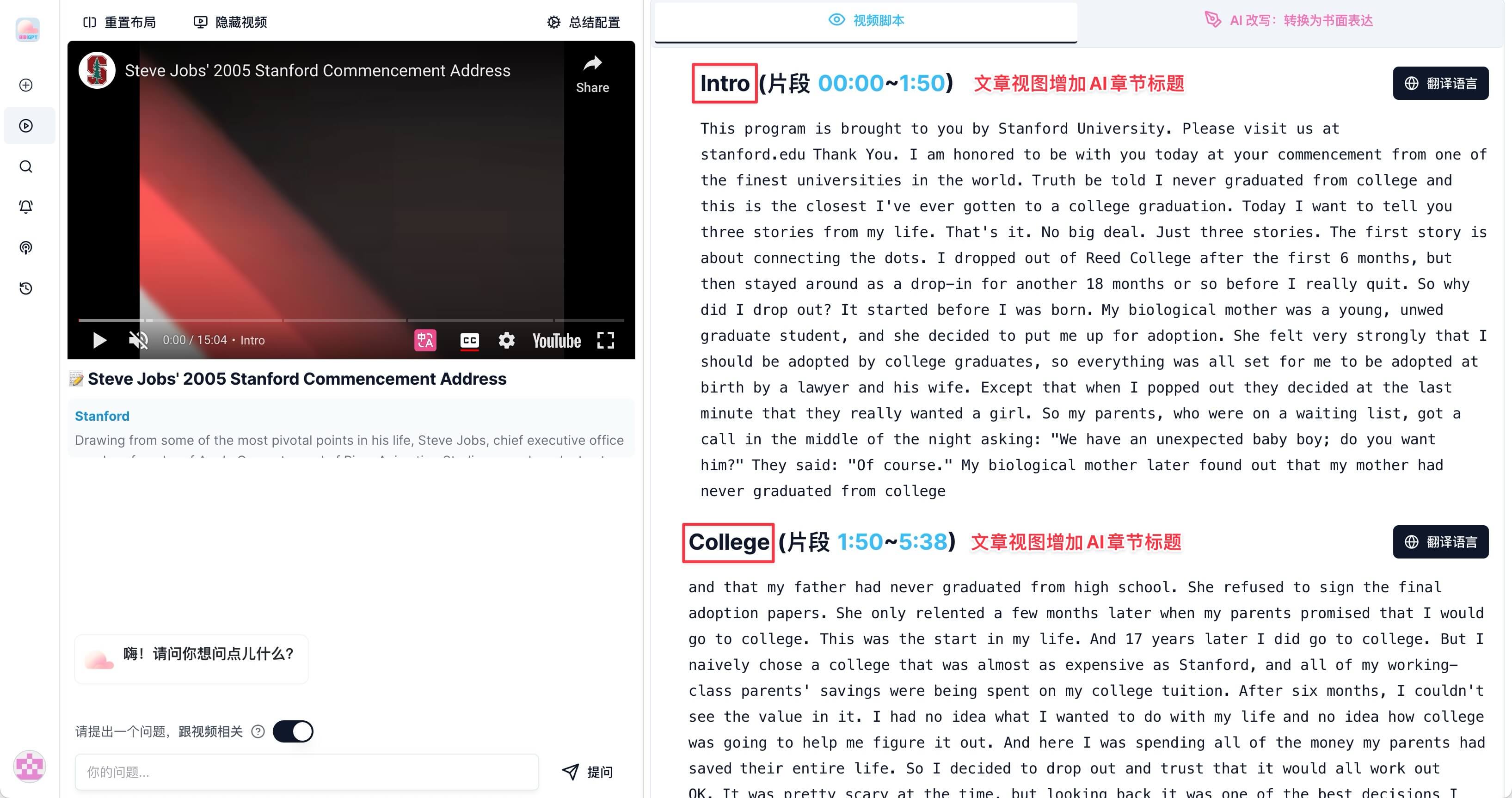 The Video Script tab now adds AI-generated chapter headings to guide your skim. They’re also included when you export Markdown.