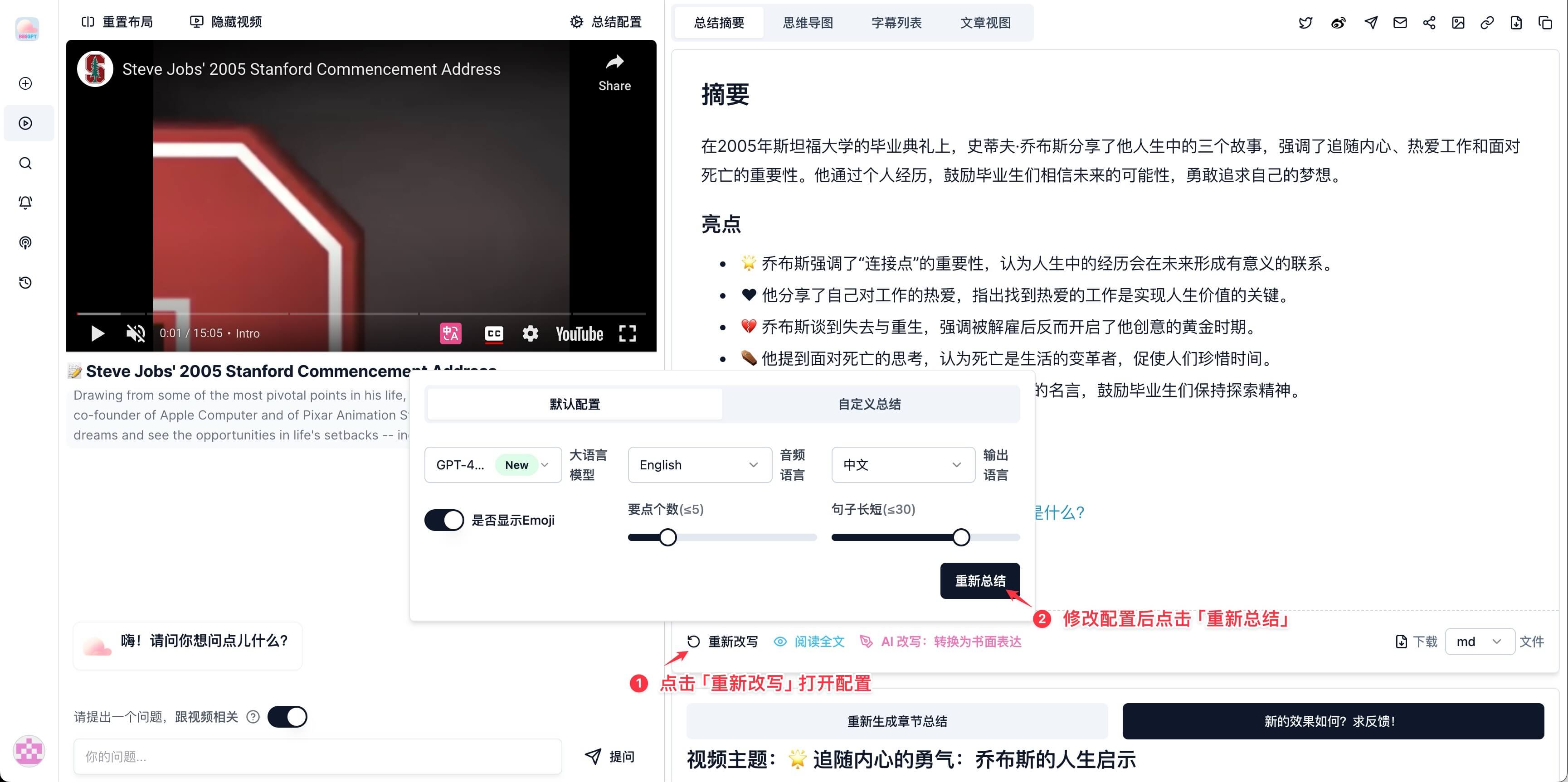Hit Rewrite beneath any summary to switch between default and custom configurations without re-uploading the video. Tailor tone, detail level, or model choice on the fly.