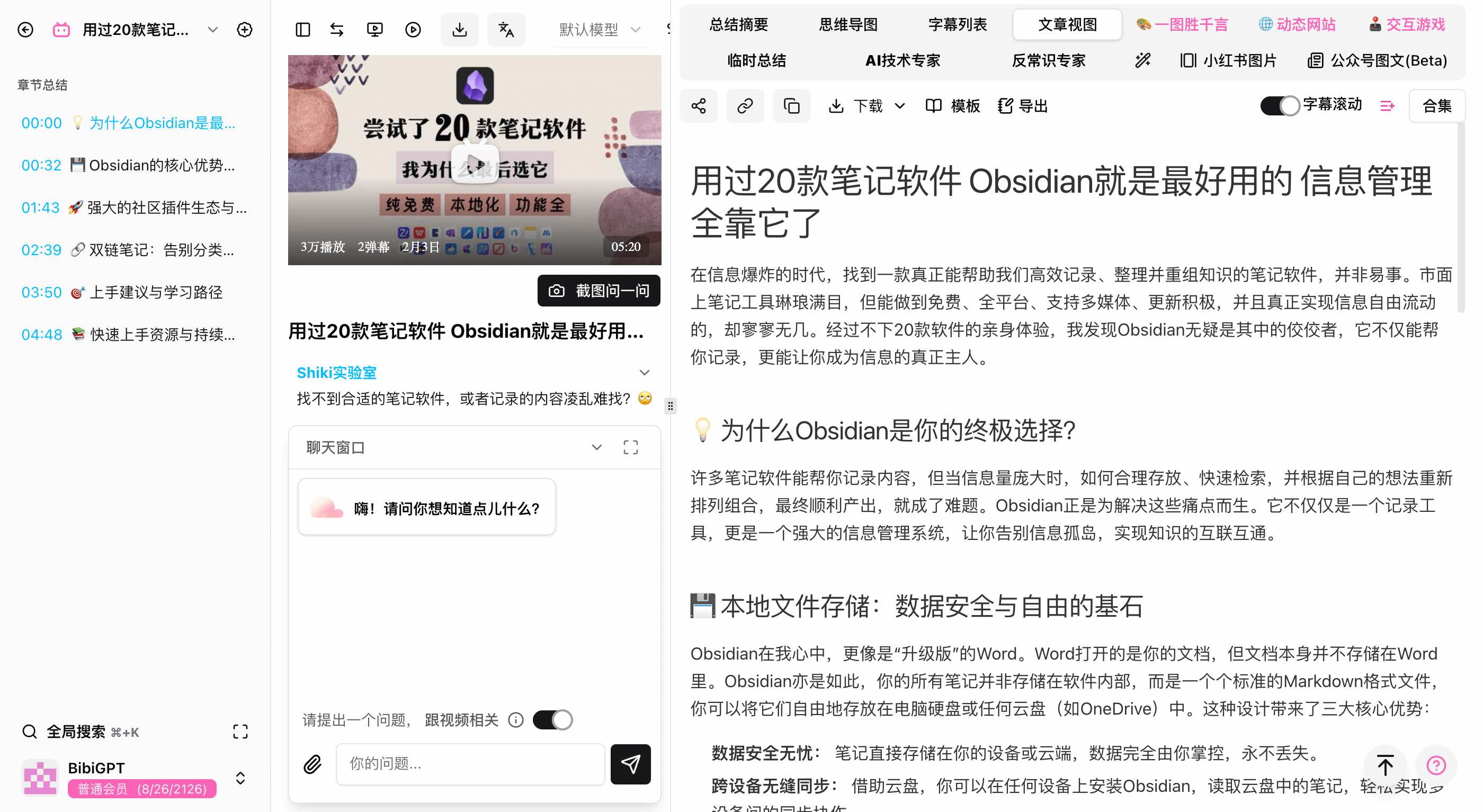 - AI Chat – Ask follow-up questions right inside the summary: “What is Obsidian, and how is it different from Word?” BibiGPT answers using video context, acting like an on-demand mentor.