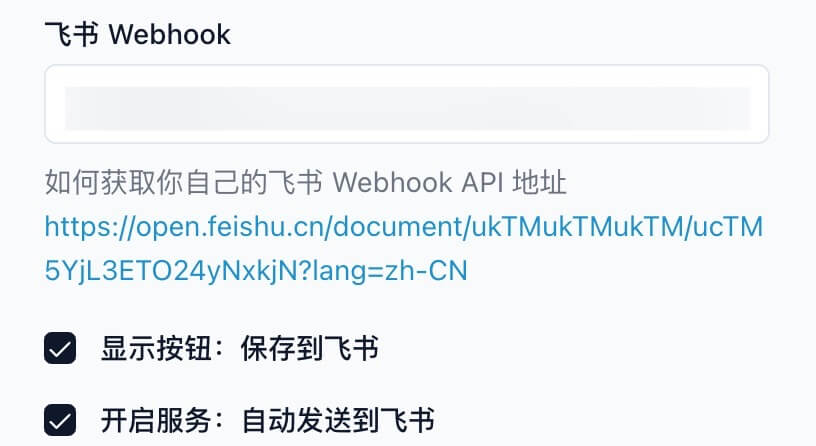 - 配置Webhook地址:返回BibiGPT的账号绑定页面,将您刚刚获取的飞书Webhook地址粘贴到飞书 Webhook配置项的输入框中。接着,根据您的需求,选择是否开启“显示按钮:保存到飞书”或“开启服务:自动发送到飞书”。前者允许您在生成AI总结后手动保存到飞书,后者则会自动将总结发送至飞书。