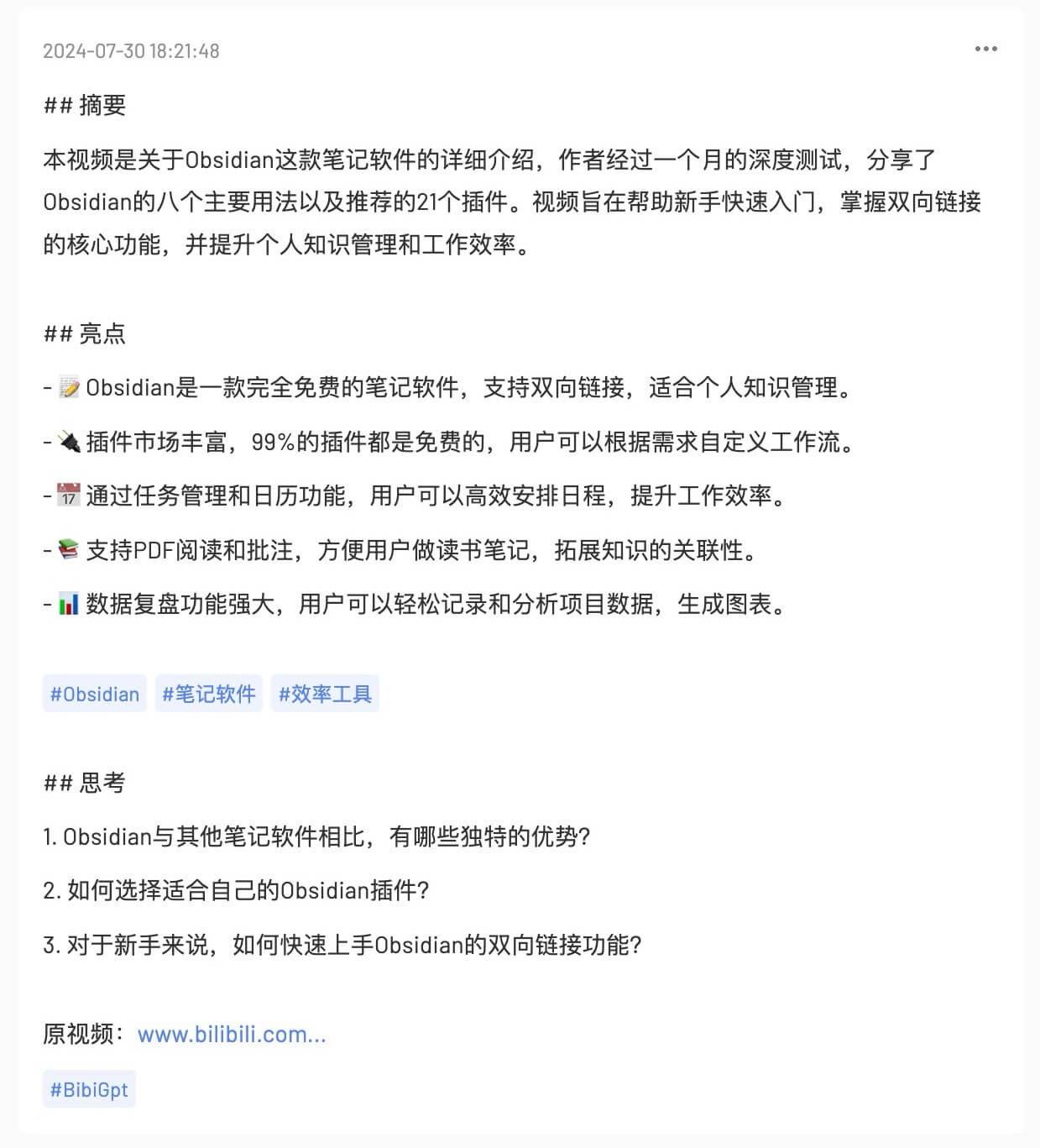 通过以上步骤,您可以便捷地将BibiGPT生成的音视频总结同步到Obsidian,帮助您更好地组织和回顾重要信息。这一功能为您的学习和工作提供了强大的支持,让您随时随地都能获取所需的知识。