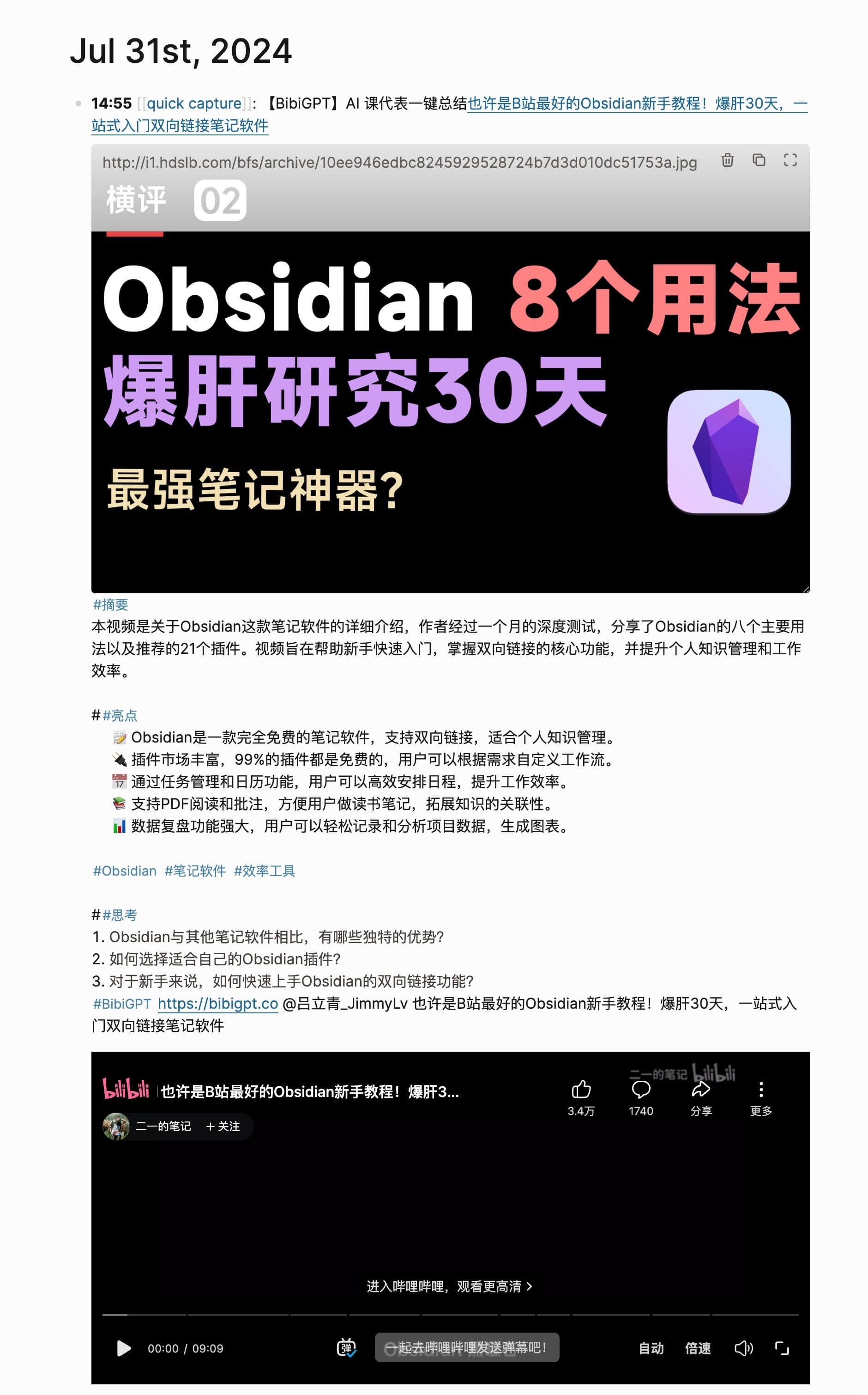 在信息爆炸的时代,如何高效处理和总结音视频内容成为了许多用户的需求。BibiGPT作为一款强大的AI音视频总结工具,最近推出了新的功能,允许您将总结内容同步到Email、Notion、Flomo、飞书、Readwise、Roam Research、Roam Quick Capture、Tana、Obsidian和Logseq等多个平台。这一功能不仅提升了您的工作效率,也使得信息管理变得更加灵活和便捷。