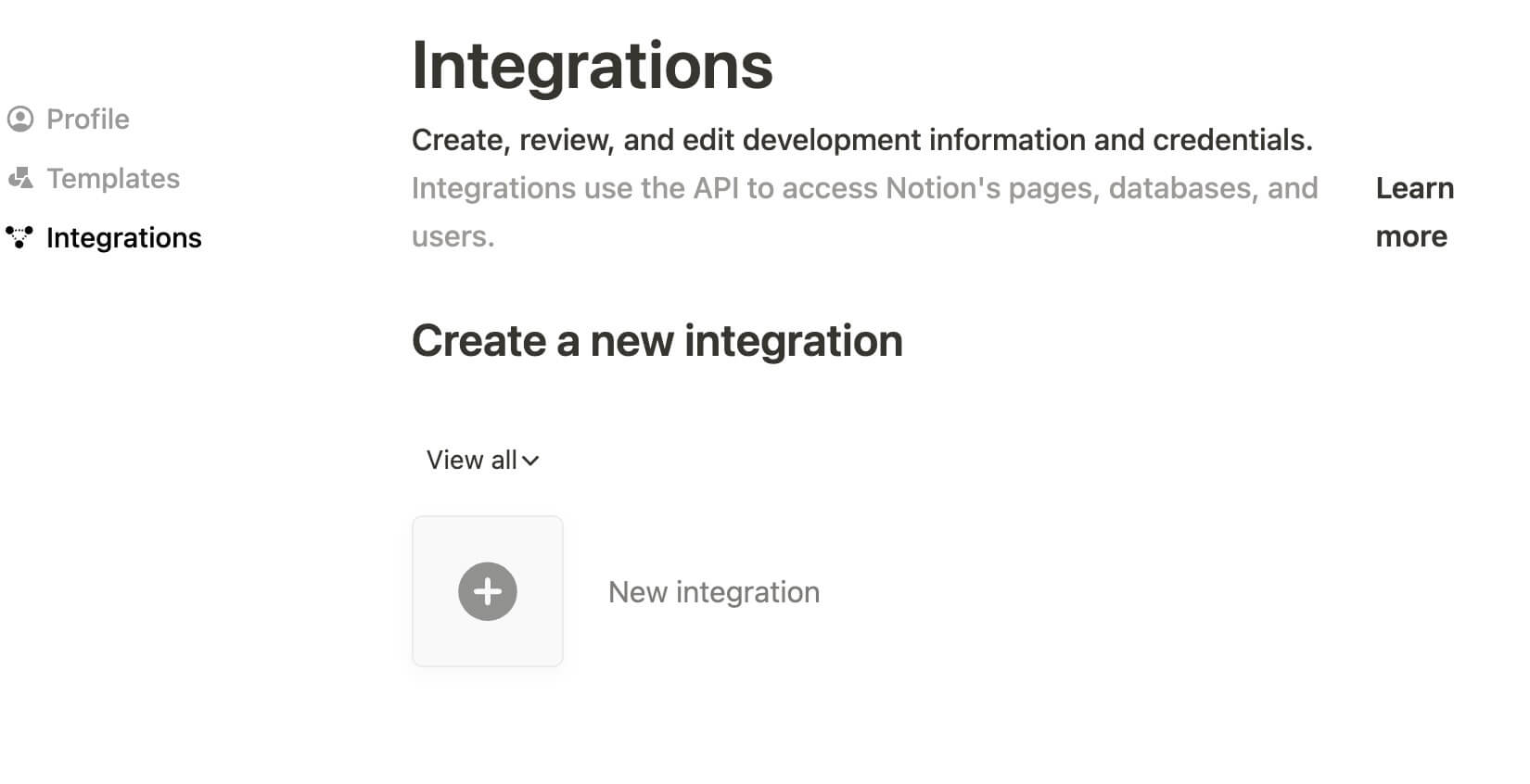 获取Notion Token:点击以下链接访问Notion的集成页面:Notion集成页面。在此页面,您需要创建一个新的集成,系统将为您生成一个唯一的Notion Token。请确保复制该Token,以便后续使用。
