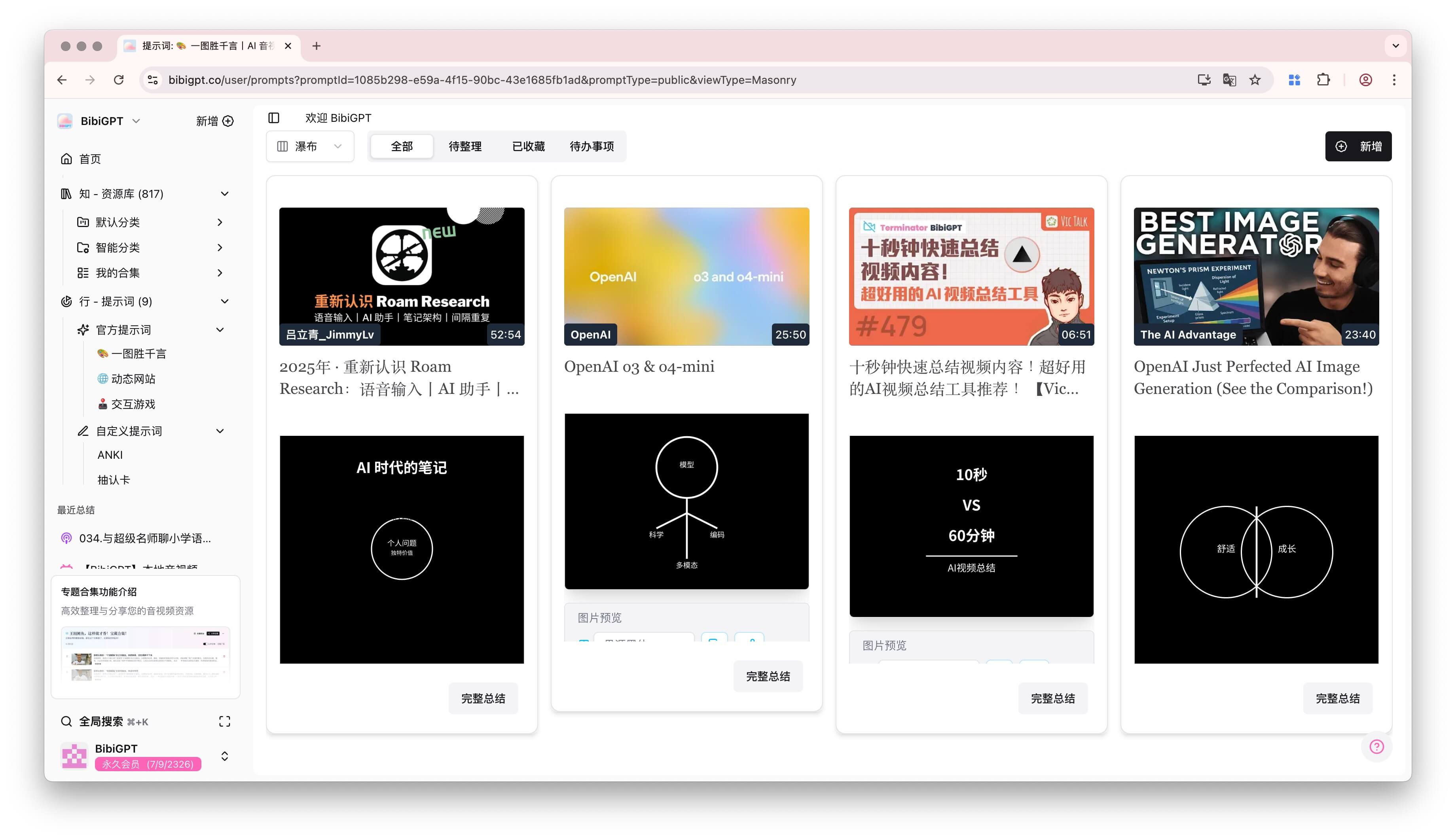 Every time you run a custom prompt, BibiGPT logs it. In the left sidebar, open Actions → Prompts → Official Prompts. You’ll find: