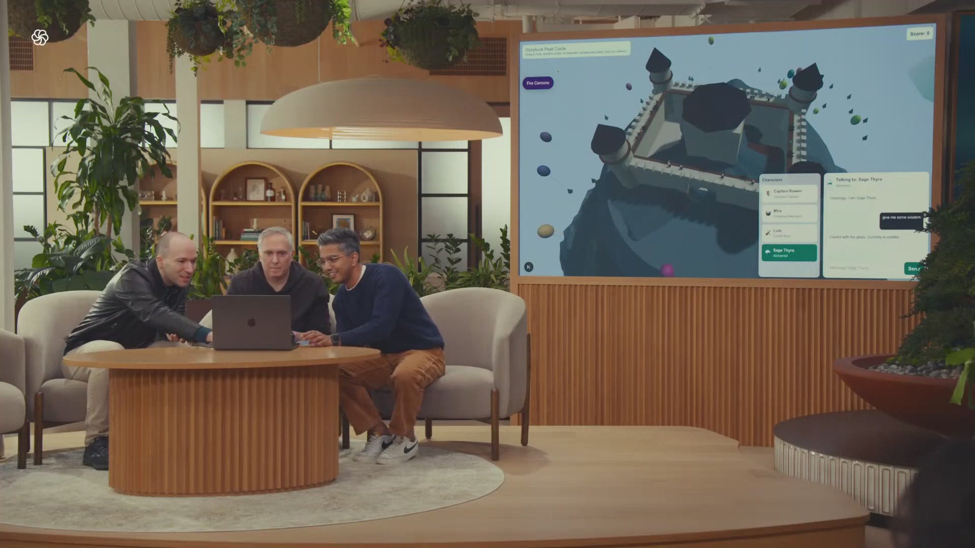 The demo then pivoted to pure creativity: “build an epic fairytale castle perched on a mountaintop, with guards on the walls firing cannons, horses roaming the courtyard, fog rolling through the sky, and a balloon-popping mini-game with sound effects and a scoreboard.”